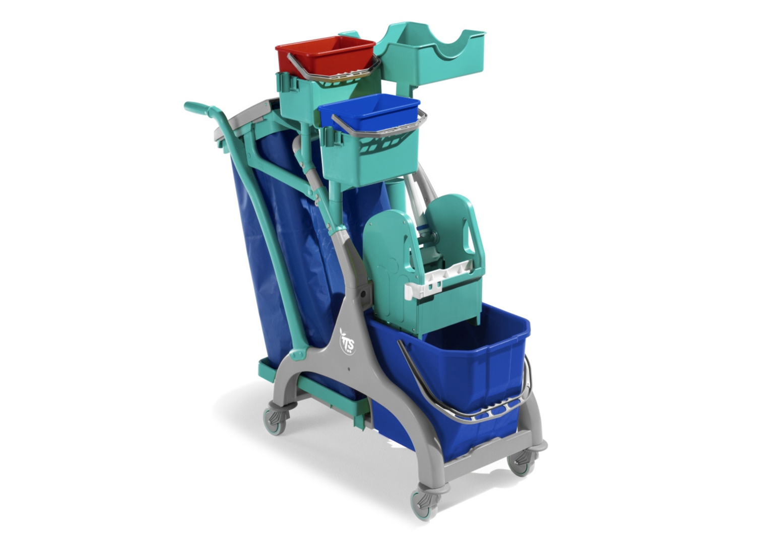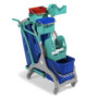 Karrocë pastrimi me kovë larjeje, mbajtës qese, kova 4 L, legen për mjete dhe rrota Ø 80 mm.