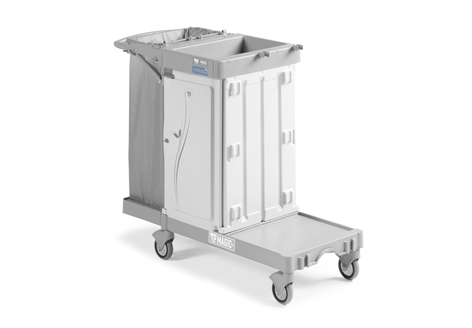 Karrocë hoteli me hapësirë magazinimi të mbyllur dhe mbajtës qese të palosshëm.