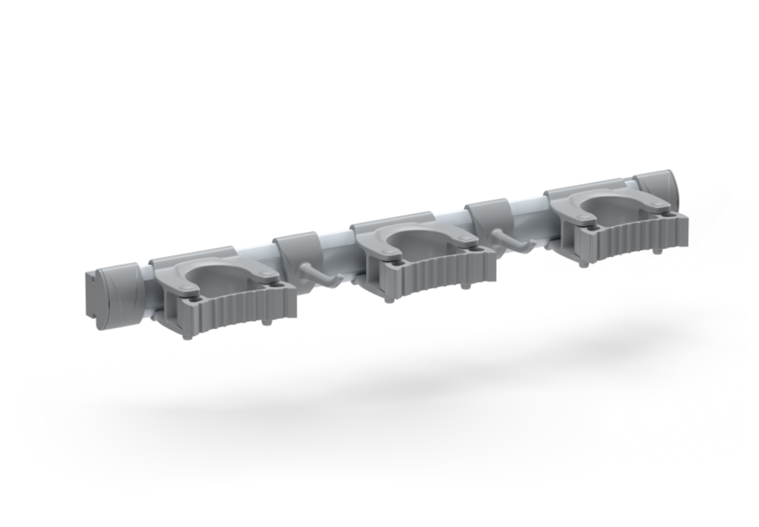 Shirit alumini për varjen e pajisjeve, i kompletuar me 3 mbajtëse për doreza me diametër ø 20–30 mm dhe 2 grepa.